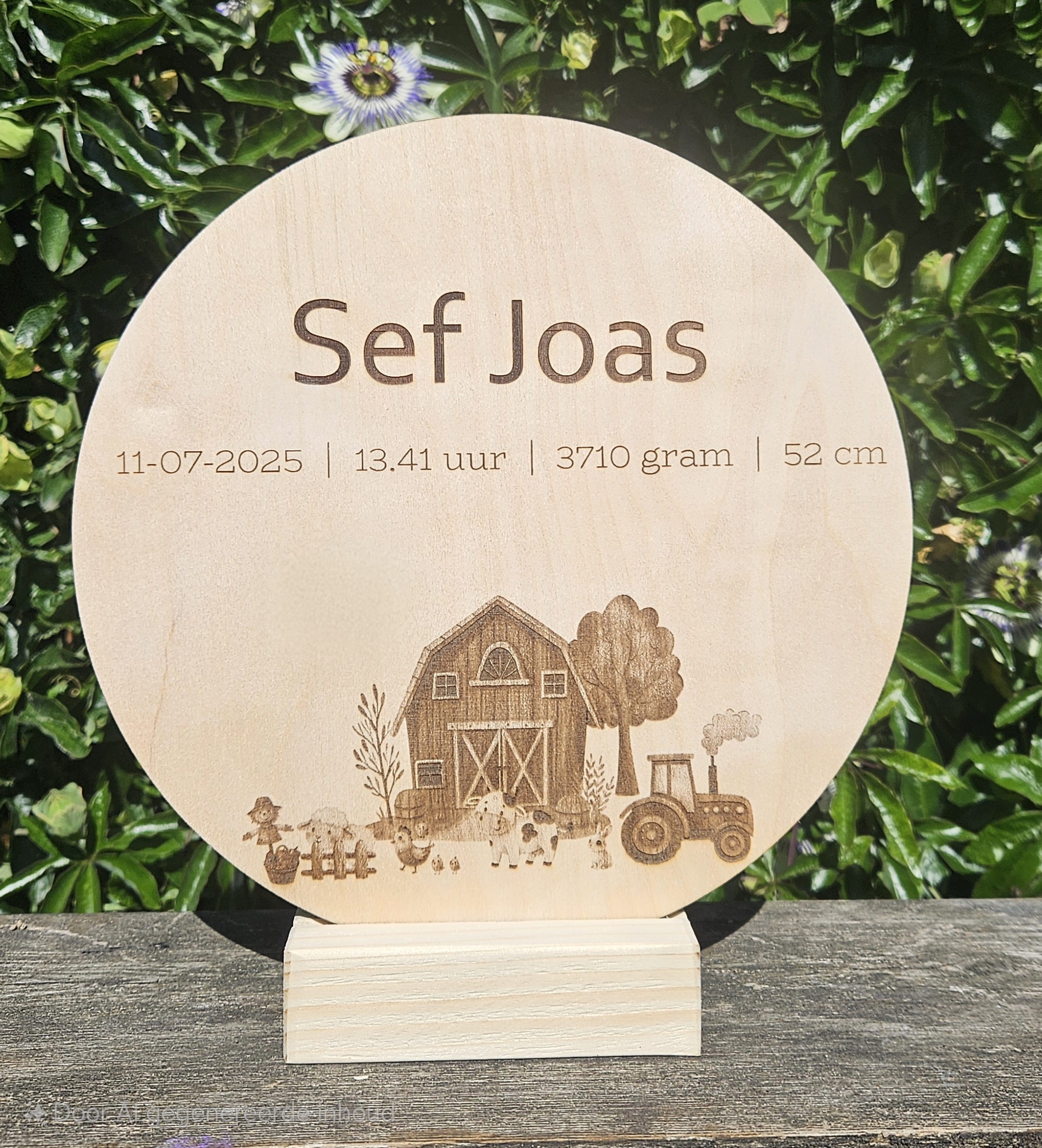 Perfect als kraam cadeau of als decoratie voor de baby kamer. Het bordje staat stevig in de bijgeleverde houten standaard en